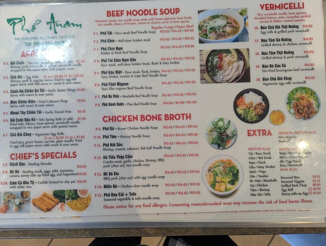 Pho Anam Restaurant has become a staple in Corona's food scene by blending traditional Vietnamese culinary craft with warm hospitality under new management. Our team treats every customer like a valued friend, focusing on a personal dining experience that extends beyond serving food. Our pho features clear, richly flavored broth with diverse protein choices including rare steak, filet mignon, tendon, and brisket, alongside popular vegetarian broths. Star dishes like crispy egg rolls and beef spring rolls complement our menu, each prepared fresh daily.